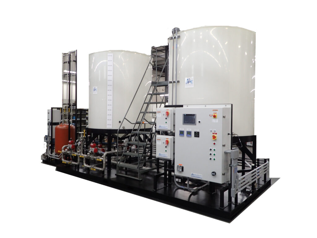 - (2) 600-gallon polypropylene cone-bottom mix tanks on epoxy-coated steel stands