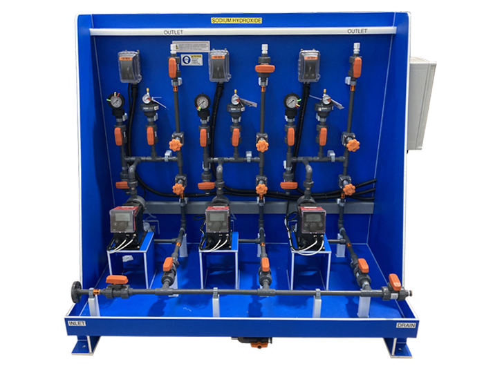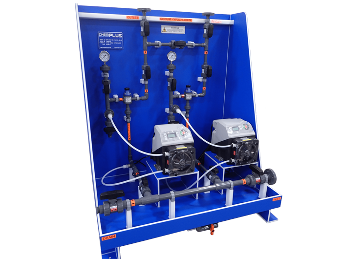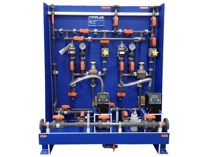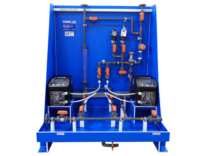 ChemPlus Triplex: Incorporates three metering pumps for lead/lag operation, redundancy, or multiple-chemical dosing. It can also increase flow capacity by running multiple pumps in tandem.