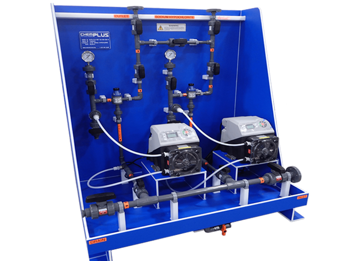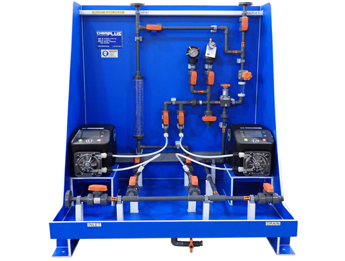 Chemical Feed Systems (also known as Chemical Dosing Systems) are essential components in wastewater treatment, designed to inject chemicals that adjust pH, remove dissolved or suspended solids, and support final water purification. The ChemPlus series offers durable, corrosion-resistant chemical feed skids engineered for reliability and flexibility. The ChemPlus Duplex model includes two metering pumps with either common or independent inlet and discharge configurations, while the ChemPlus Triplex model features three pumps for higher capacity or multi-chemical dosing applications.